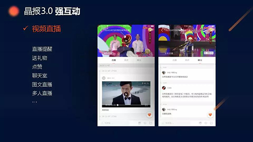 不僅如此,在“視頻直播”版塊,用戶可以邊看直播邊送禮物、點贊、進入聊天室發表意見;在“問吧”、“投票”、“爆料”等版塊,用戶可以把疑問、意見建議和身邊大小事通過APP平臺發送給晶報,形成雙方互動等等。